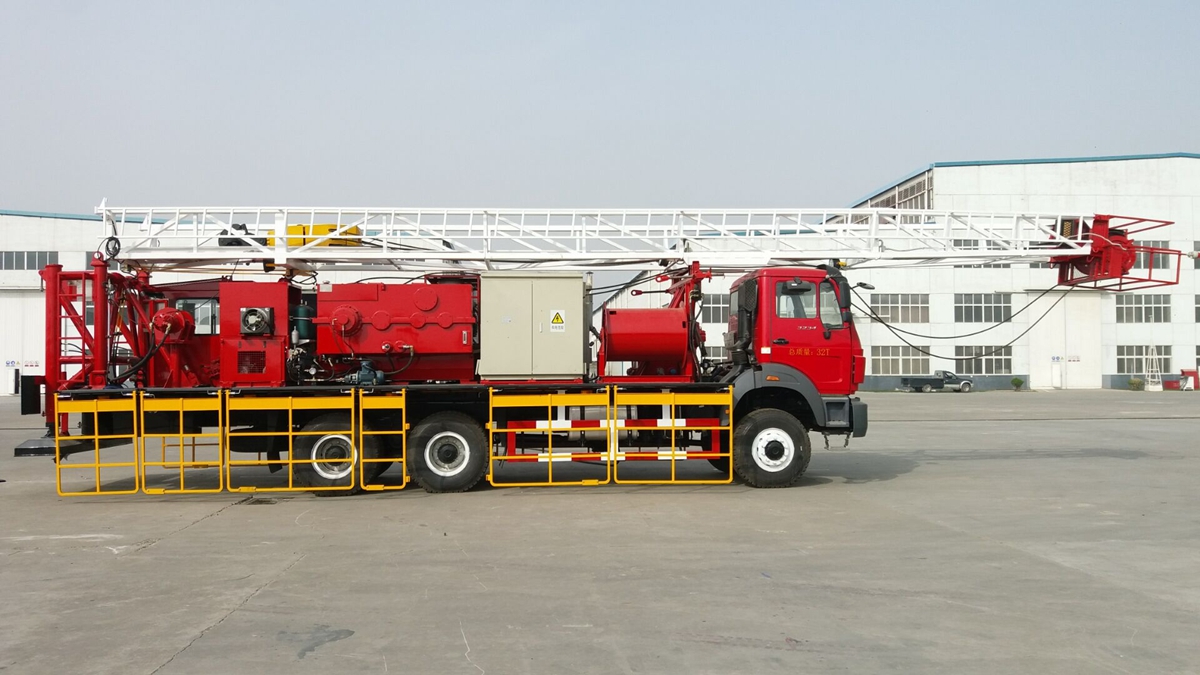車裝修井機是將動力系統、絞車、井架、游車系統及傳動系統等部件安裝于自走式底盤上。整機具有結構緊湊,集成度高,占地面積小,移運快捷,搬遷效率高等特點。